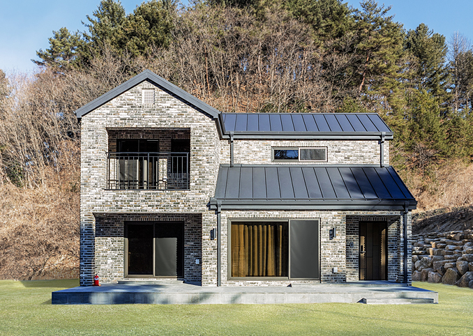 고급스러운 금속지붕마감재와 파벽돌이 조화를 이루며 세련된 인상을 완성한 전원주택입니다.